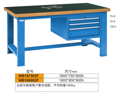 工作臺WB187503介紹: 工作臺采用優(yōu)質(zhì)冷扎板精工制作而成,堅固的工作桌框架,牢固平穩(wěn),可使工作桌承重1000kg;多種工作桌面選擇,可配合不工使用的要求; 該工作臺配置了50厚高分子復(fù)合臺面,櫸木包邊,美觀,堅固,適用于檢測,維修等;工作臺右側(cè)配2*75,1*150三抽吊柜,抽屜可配分格,有利于現(xiàn)場物料的整理,規(guī)劃。