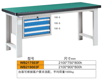 工作臺介紹WB217503: 工作臺采用優質冷扎板精工制作而成,堅固的工作桌框架,牢固平穩,可使工作桌承重1000kg;多種工作桌面選擇,可配合不工使用的要求; 工具吊柜(箱),側柜(箱)燈架,調節腳杯,外形美觀;層板,抽屜質量上乘,承重大,抽屜內可根據需要任意分隔;節約空間,適用性強
