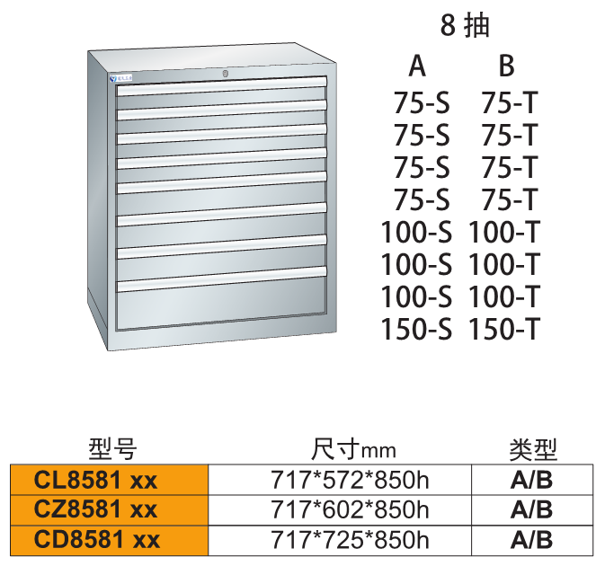 工具柜工具柜C-8581介紹:工具柜適用于工具、刀具、零部件在生產現場中的定置管理,8抽抽屜式設計,使你的物品存取工作真正做到準時、準確、卓效、低耗。