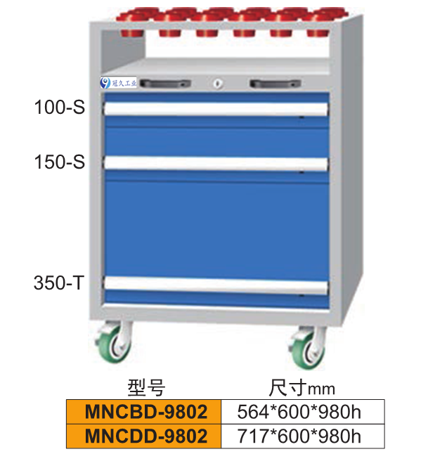 刀具車是存放、搬運刀具的裝備,此類刀具車可存BT30、BT40、BT50、HSK63、HSK100等多種型號的刀具。多邊成型的整體式側板上有模數化的人字孔,可將刀座按水平或15°、30°傾斜放置,方便多種刀具的存取。 高強度腳輪,車前為兩個定向輪,車后為兩個萬向帶 剎車輪,推行平穩(wěn),方向性好,剎車固定后不會滑動。