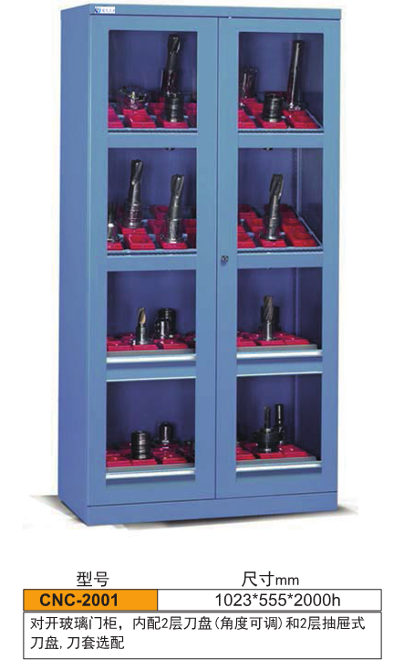 刀具柜,是專門用來存放各種車床上常用刀具的柜子。刀具柜的柜體一般采用冷軋鋼板制成,堅固耐用。刀具柜內常有3-5個橫檔可拉抽屜,抽屜內有ABS材質的刀具套,防滑防油,以便刀具自由組合式的存放。刀具柜一般都為雙門對開式,柜體裝有可調式腳墊,柜體可調整高度,柜子防滑防潮。刀具柜常用在工廠機加工中心,便于刀具的集中管理,取用方便。