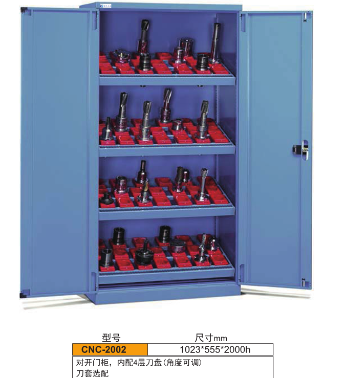 刀具柜,是專門用來存放各種車床上常用刀具的柜子。刀具柜的柜體一般采用冷軋鋼板制成,堅固耐用。刀具柜內常有3-5個橫檔可拉抽屜,抽屜內有ABS材質的刀具套,防滑防油,以便刀具自由組合式的存放。刀具柜一般都為雙門對開式,柜體裝有可調式腳墊,柜體可調整高度,柜子防滑防潮。刀具柜常用在工廠機加工中心,便于刀具的集中管理,取用方便。