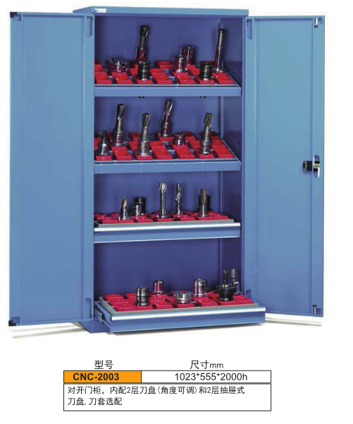 刀具柜,是專門用來存放各種車床上常用刀具的柜子。刀具柜的柜體一般采用冷軋鋼板制成,堅固耐用。刀具柜內常有3-5個橫檔可拉抽屜,抽屜內有ABS材質的刀具套,防滑防油,以便刀具自由組合式的存放。刀具柜一般都為雙門對開式,柜體裝有可調式腳墊,柜體可調整高度,柜子防滑防潮。刀具柜常用在工廠機加工中心,便于刀具的集中管理,取用方便。