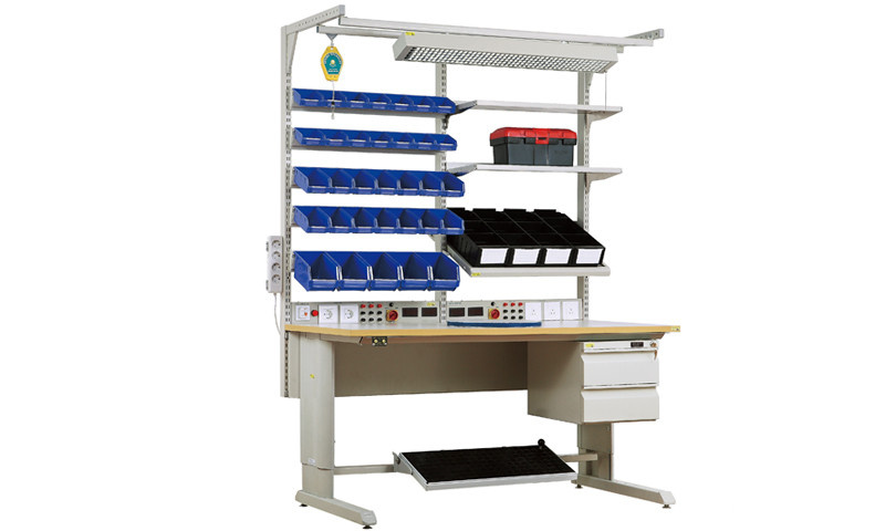 臺面具有防靜電、耐火和耐磨性,表面任意兩點電阻在106-109Ω之間,工作臺高度、水平及重心可調節,以適應不同生產要求,人性化設計的附件,支架由帶防靜電漆的鋼板制成,堅固耐用,承載能力:500kg,高度調節范圍:670-1120mm。