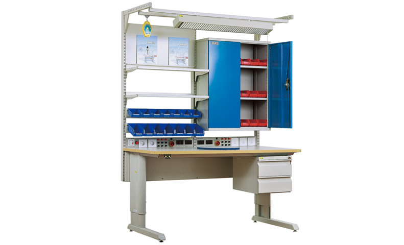 臺面具有防靜電、耐火和耐磨性,表面任意兩點電阻在106-109Ω之間,工作臺高度、水平及重心可調節,以適應不同生產要求,人性化設計的附件,支架由帶防靜電漆的鋼板制成,堅固耐用,承載能力:500kg,高度調節范圍:670-1120mm。