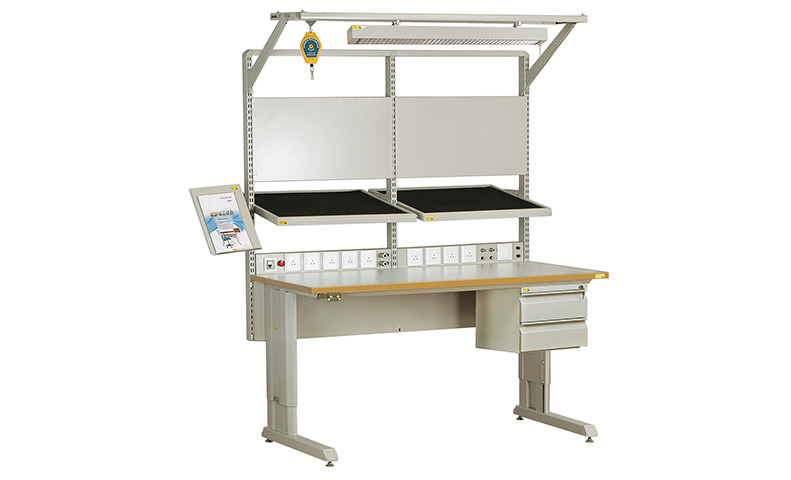 臺面具有防靜電、耐火和耐磨性,表面任意兩點電阻在106-109Ω之間,工作臺高度、水平及重心可調節,以適應不同生產要求,人性化設計的附件,支架由帶防靜電漆的鋼板制成,堅固耐用,承載能力:500kg,高度調節范圍:670-1120mm。