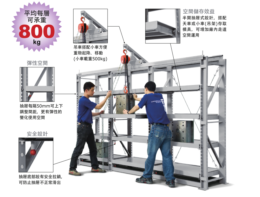 4、輕型模具貨架層載在200到800kg/層。重型抽屜式貨架層載在:800到1500kg/層。