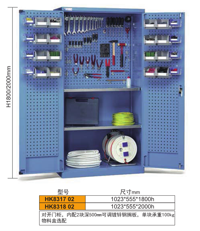 5、柜體門內板上帶有方孔和百葉掛板、可掛各類物件及工具。