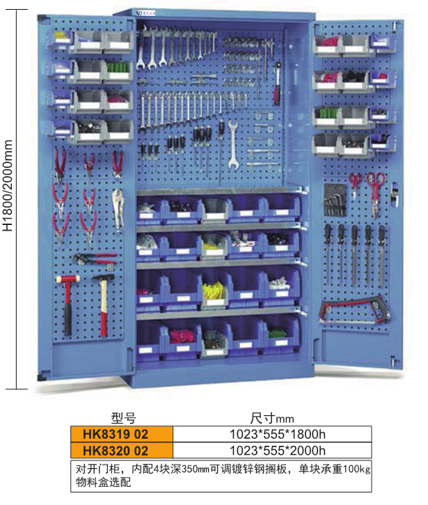 5、柜體門內板上帶有方孔和百葉掛板、可掛各類物件及工具。