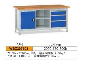 組合工作臺介紹: 工作臺采用優質冷扎板精工制作而成,堅固的工作桌框架,牢固平穩,可使工作桌承重1000kg;多種工作桌面選擇,可配合不工使用的要求; 工具吊柜(箱),側柜(箱)燈架,調節腳杯,外形美觀;層板,抽屜質量上乘,承重大,抽屜內可根據需要任意分隔;節約空間,適用性強