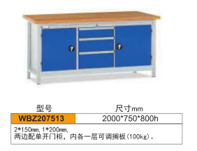 工作臺介紹: 工作臺采用優質冷扎板精工制作而成,堅固的工作桌框架,牢固平穩,可使工作桌承重1000kg;多種工作桌面選擇,可配合不工使用的要求; 工具吊柜(箱),側柜(箱)燈架,調節腳杯,外形美觀;層板,抽屜質量上乘,承重大,抽屜內可根據需要任意分隔;節約空間,適用性強
